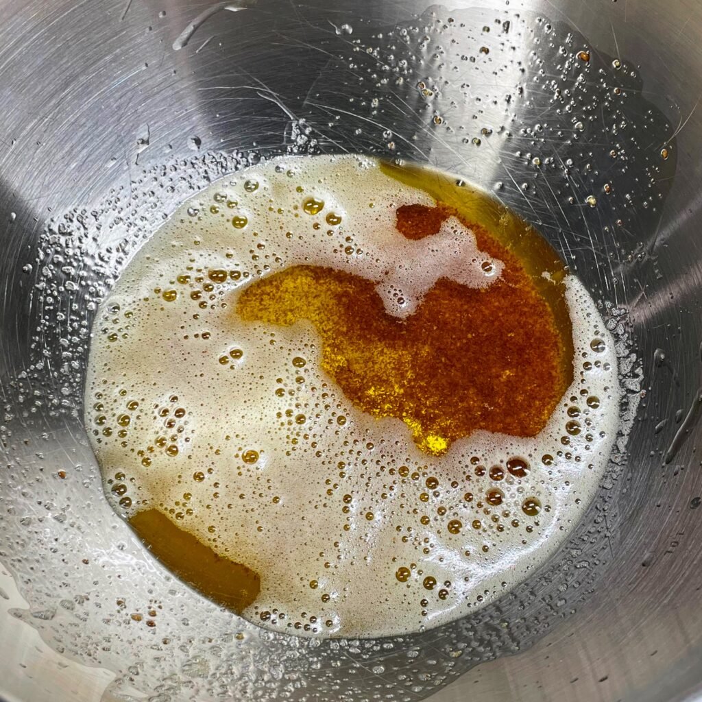 Place your butter in a saucepan over medium heat. It will melt, foam, and then turn golden brown with tiny brown bits at the bottom. Stir often – it can burn quickly. Once it smells nutty and caramel-like, remove it from the heat and pour it into a bowl, scraping in all those brown bits. Let it cool for 15–20 minutes until warm, not hot.