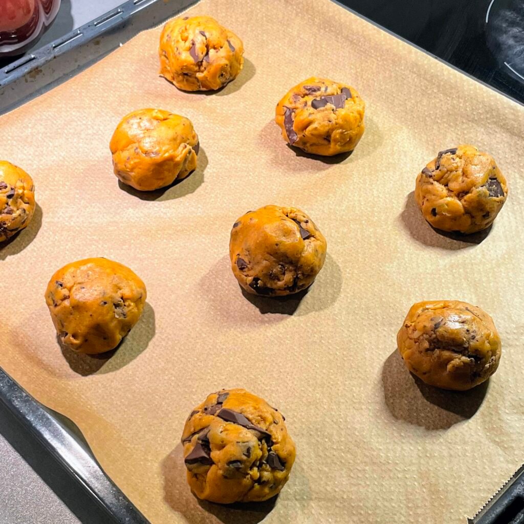 Preheat your oven to 190°C (375°F). Line a baking tray with parchment paper and arrange 6–8 dough balls per tray, leaving some space between each. Bake for 11–13 minutes, just until the edges are golden brown but the centers still look soft.