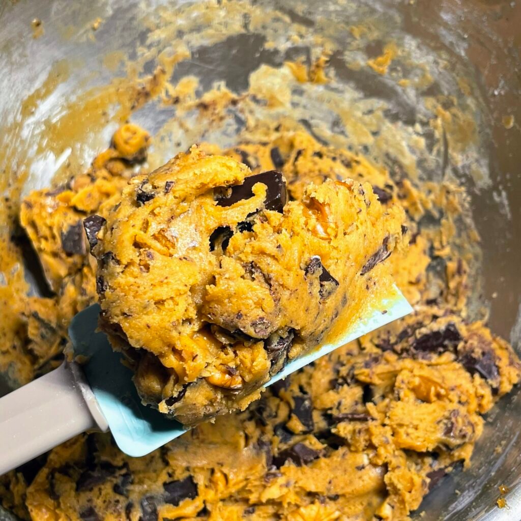Fold in the chopped chocolate and toasted nuts using a spatula. Make sure they’re evenly spread throughout the dough so you get bits of chocolate and nut in every bite. You can also press a few extra chocolate chunks on top before baking for that bakery-style look.
