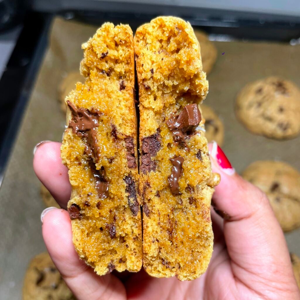 To enjoy them warm again, microwave one for 10–12 seconds. You’ll get that fresh-out-of-the-oven gooey texture back instantly. If you want to make ahead, freeze the unbaked dough balls. Bake them straight from frozen — just add a minute or two to the baking time.