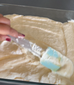 - Pour into an ungreased 35×25 cm glass dish. Smooth the top.