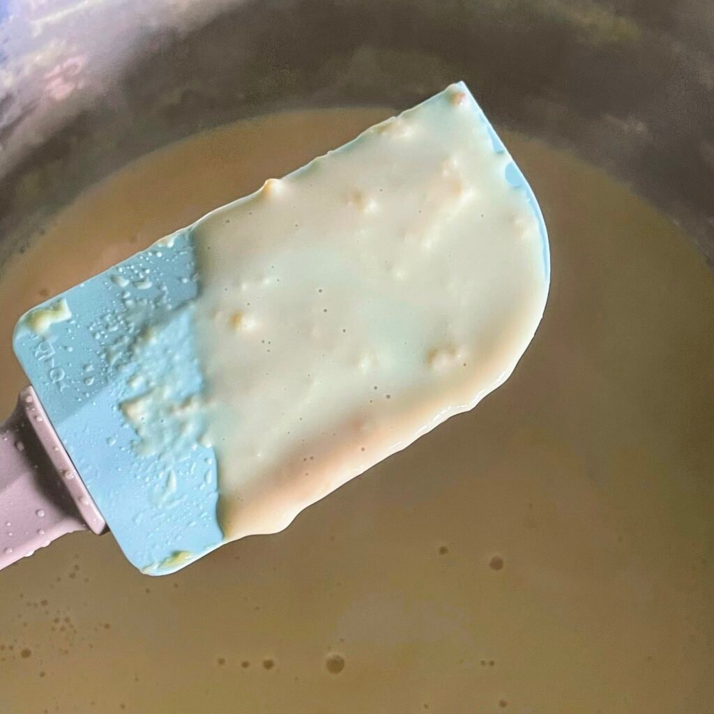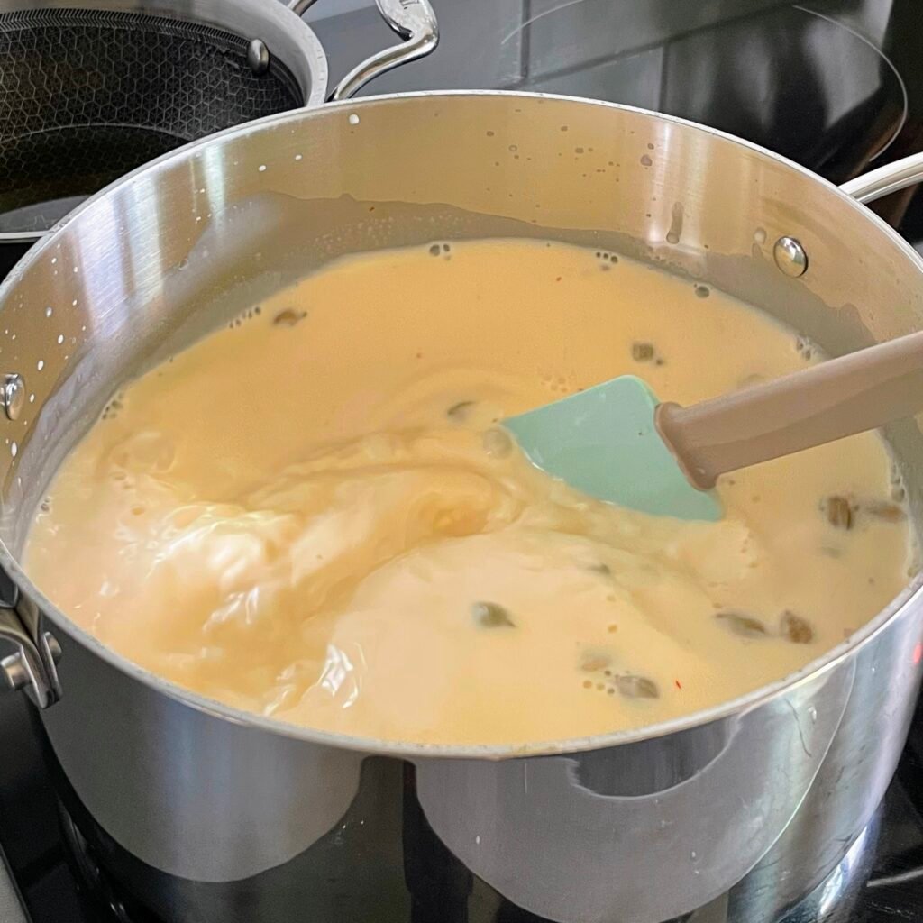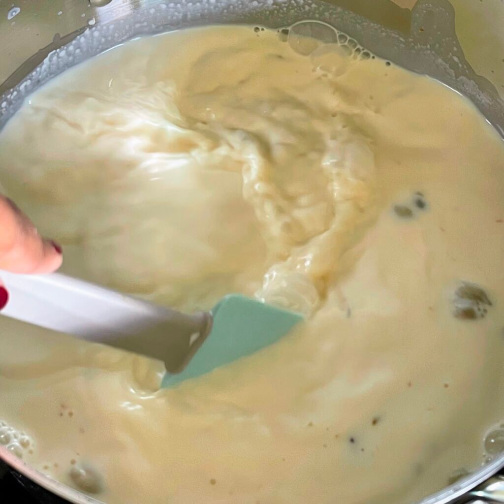 - Stir in condensed + evaporated milk and a tiny pinch of salt.